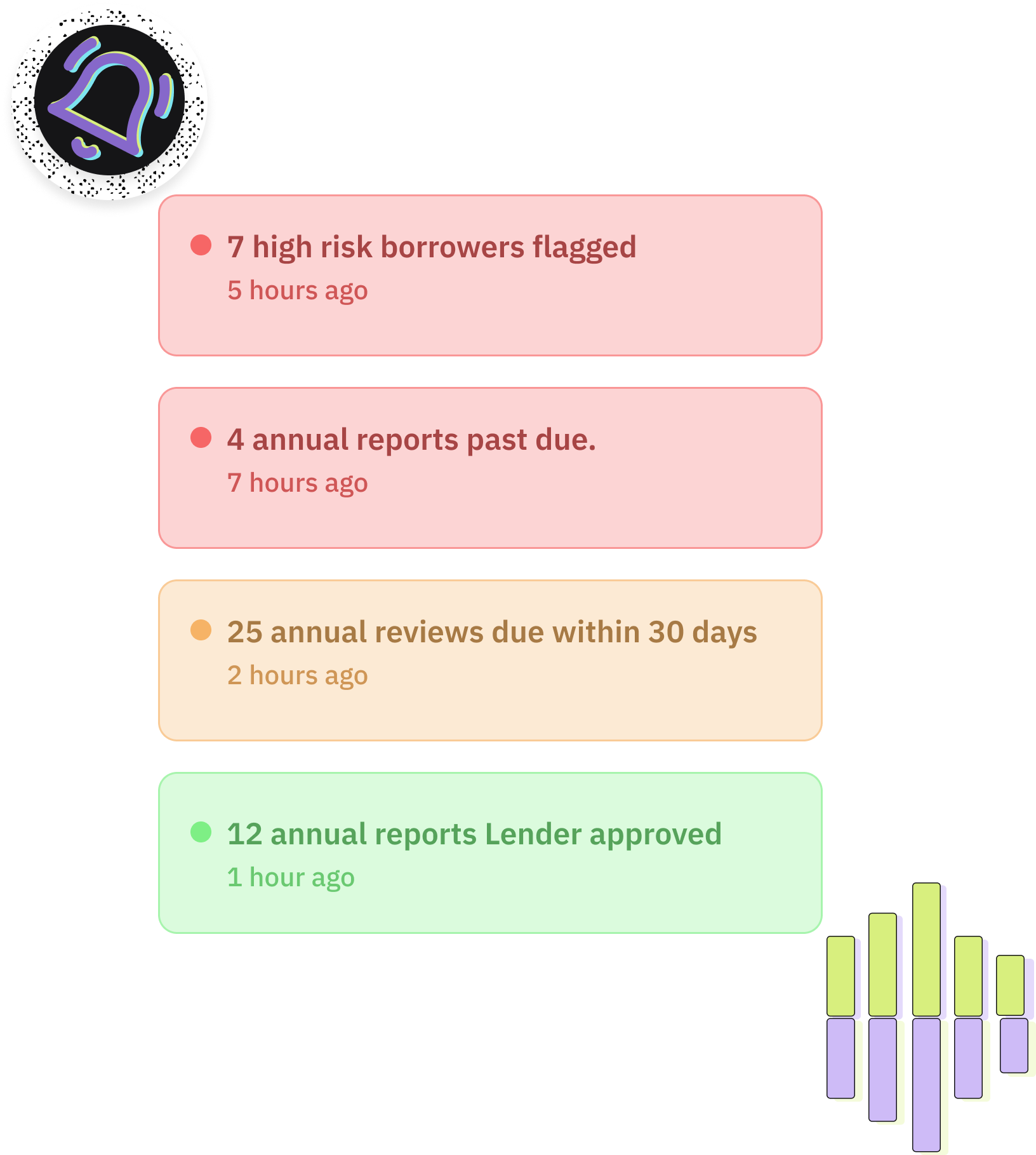 Portfolio Watch is an intelligent, automated tool that collects financial statements, analyzes trends, flags risks, and alerts lenders when action is needed. By automating portfolio oversight and generating annual review memos, it frees lenders to focus on new loans while ensuring consistent, proactive borrower monitoring.